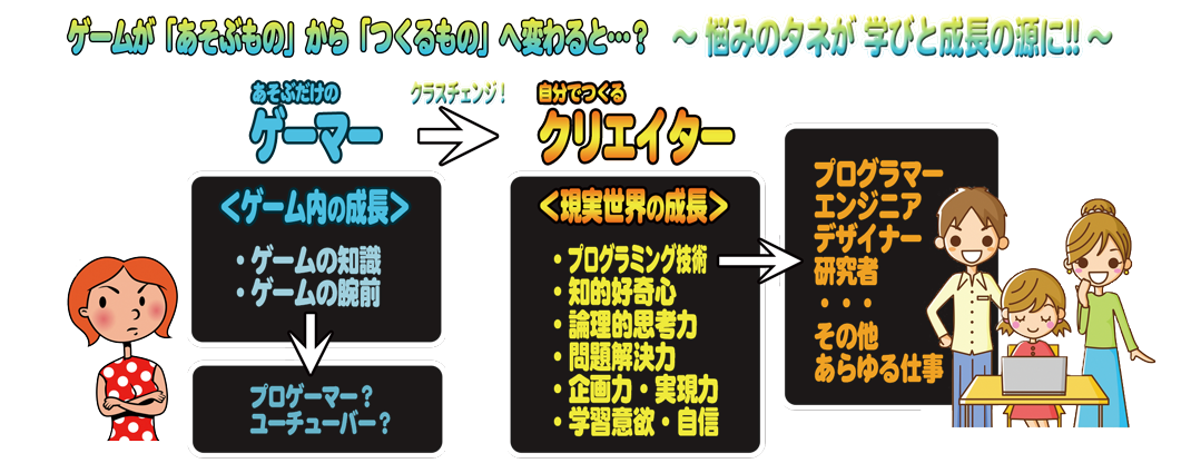 『ゲームに向けるパワーをもっと違うところに向けてくれたら…』ゲーム好きの子を持つ親なら、誰でも一度は思うことでしょう。 ゲームに熱中する姿に、将来の心配をするくらいなら、一歩踏み込んで「ゲームの中身」に目を向けさせてみましょう。ただ遊ぶだけの「コンテンツ消費者」から抜け出して「つくり手」になる。この違いはとてつもなく大きなものになります。